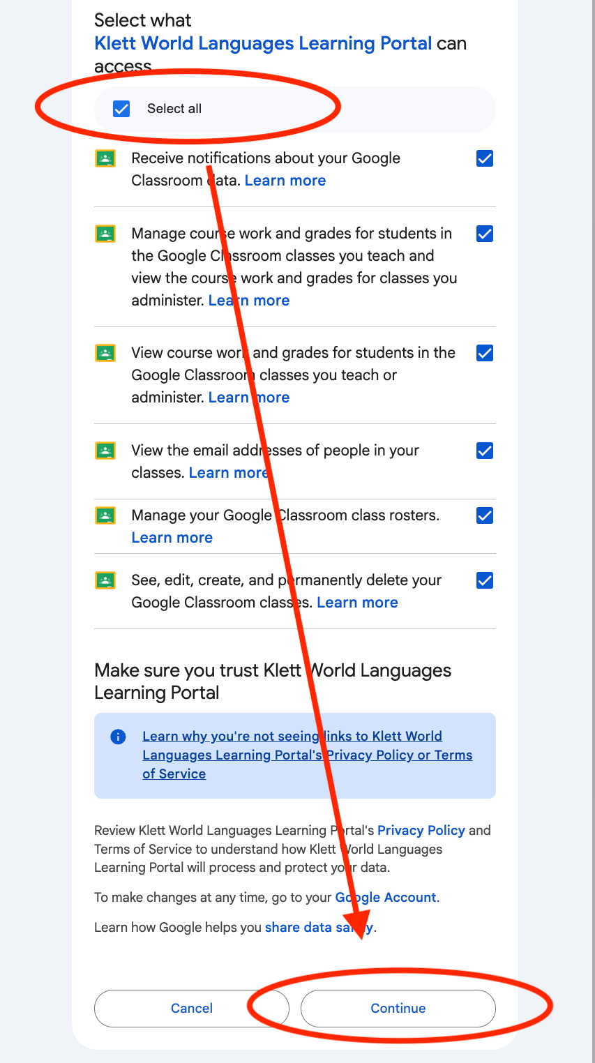 You will receive a consent pop-up when you log in for the first time. Review the permissions, then click "Select all" to provide consent. Click Continue.