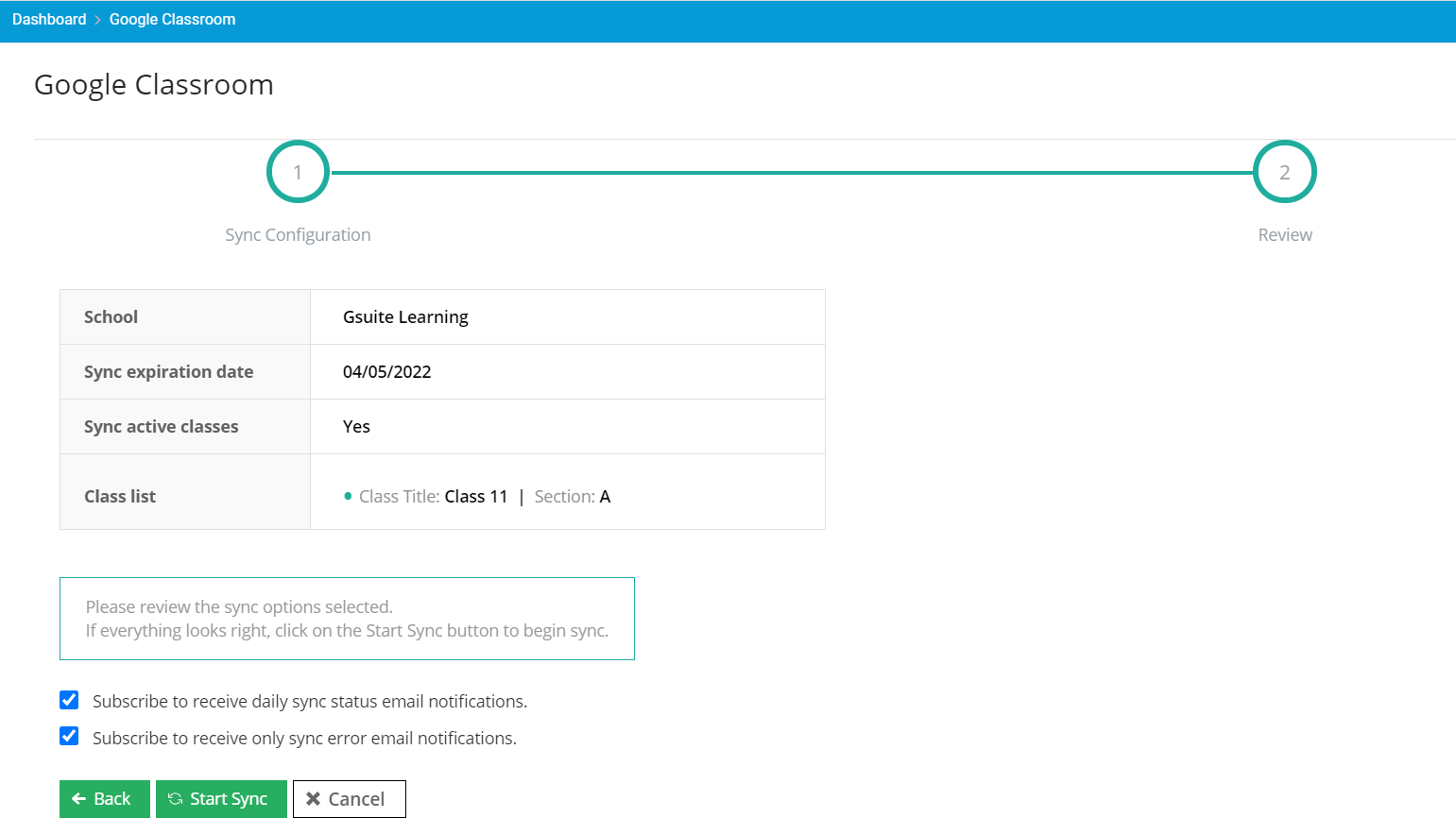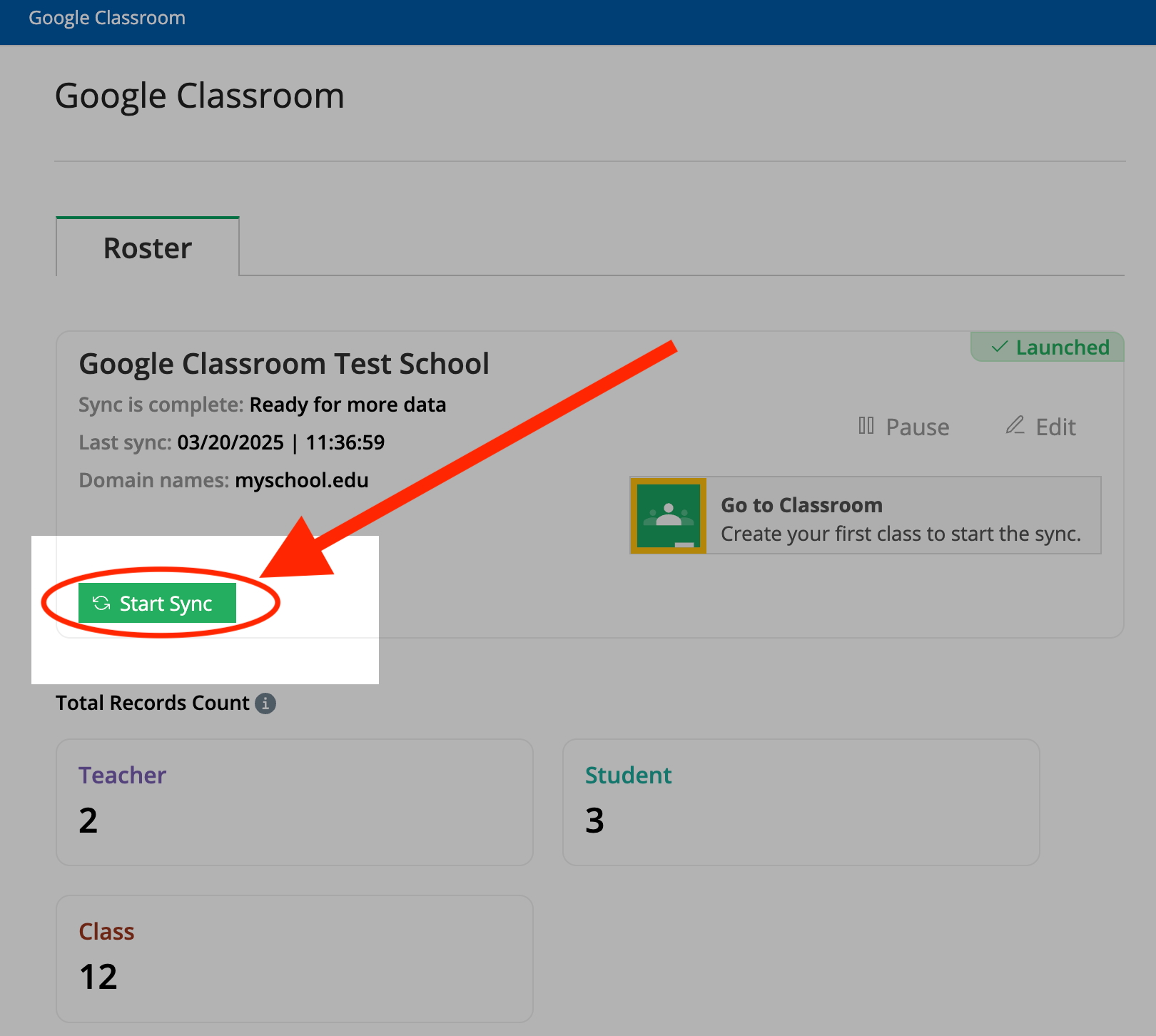 You will be directed to the Google Classroom sync page. Click on the Green "Start Sync" button to begin the sync.