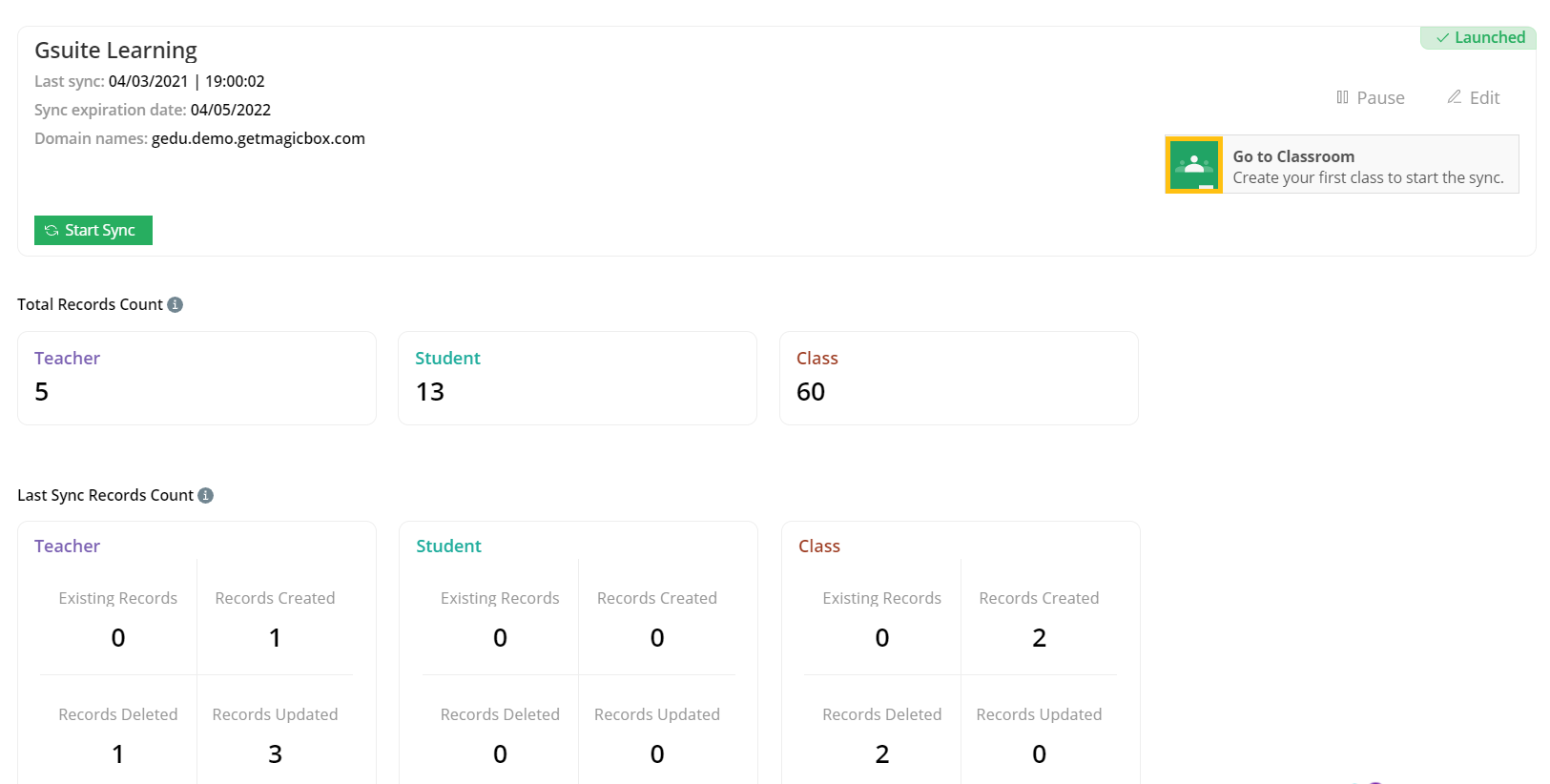 Once you click "Start Sync," you will be redirected to a summary page. This page will share the complete data of total teachers, students, classes and the last sync records count.